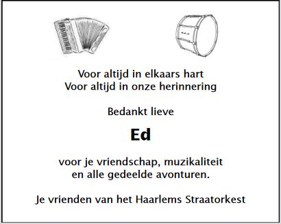 Het Haarlems Straatorkest zal Eric lang blijven missen maar zijn muzikale erfenis zal ons tijdens de repetities en optredens aan hem blijven herinneren.