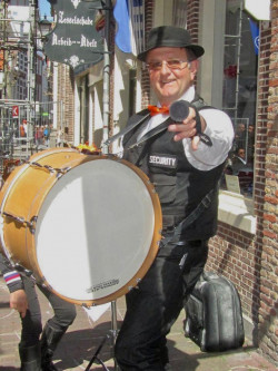 Hij speelde bij ons alleen de snare. Geen basedrum. En dat was even wat anders voor een rasdrummer. Hij kreeg wel een mooie percussiegroep om zich heen en een grote trom speler naast hem. Verder kreeg hij het met de dirigent aan de stok: een geweldige R&B speler maar dan…..ska, klezmer, wals, en balkanritmes met als moeilijkste een 7/8 maat.